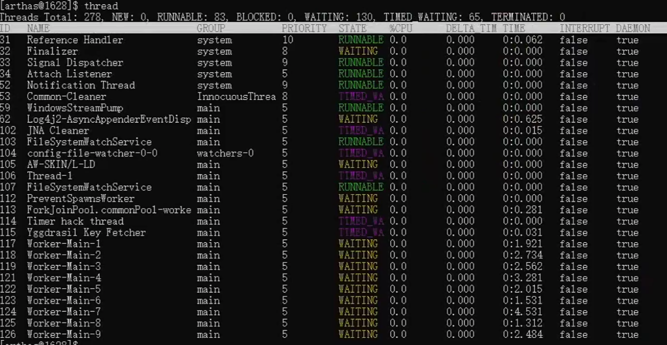 随后我输入了线程命令,来查看所有线程的状态: